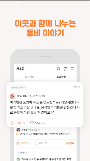 그리고, 중고 거래만이 아닌 우리 동네의 다양한 이야기를 이웃과 함께 나눌 수 있으며, 공감과 댓글로 동네에서 일어나는 정보를 공유할 수 있어 편리하게 활용이 가능합니다. 특히 동네 분실센터를 통해 무언가를 잃어버렸을 때, 함께 찾을 수 있다는 부분과 동네 모임을 통해 관심사가 비슷한 이웃과 온·오프라인으로 모일 수 있어 취미를 공유할 수 있는 동네 친구를 만들어 볼 수 있습니다.