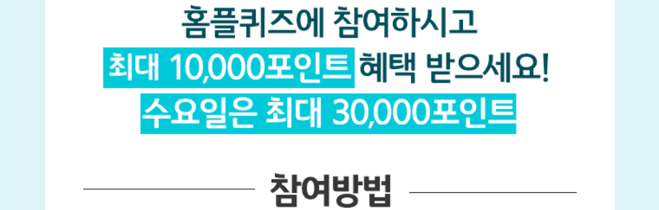 홈플퀴즈에 참여하시면, 매일 최대 10,000포인트 적립이 되며, 특히 수요일은 최대 30,000포인트까지 적립이 가능합니다.