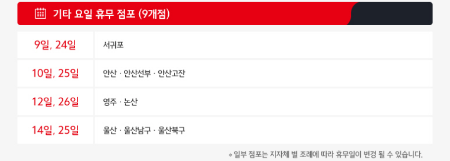 기타 요일 휴무 점포 (9개점)