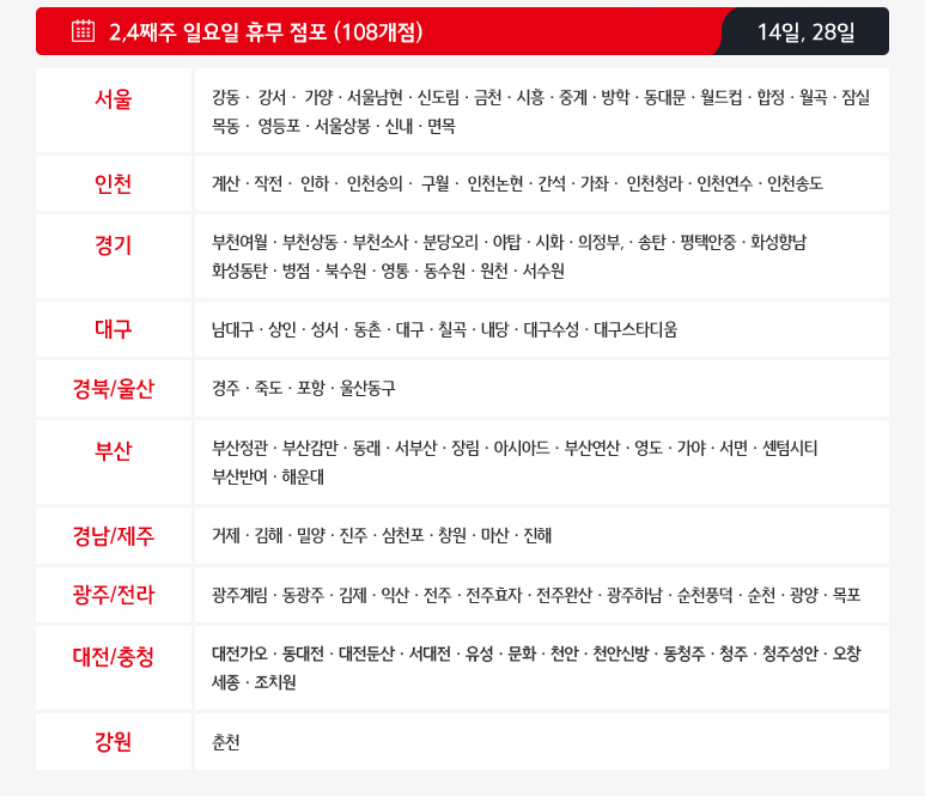 2,4째주 일요일 휴무 점포 (108개점) 14일, 28일